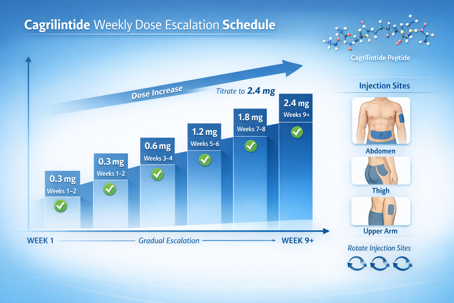 Based on clinical trial protocols, cagrilintide peptide dosage typically follows a structured escalation schedule designed to improve tolerability. While specific protocols may vary across research settings, the general framework includes these principles: