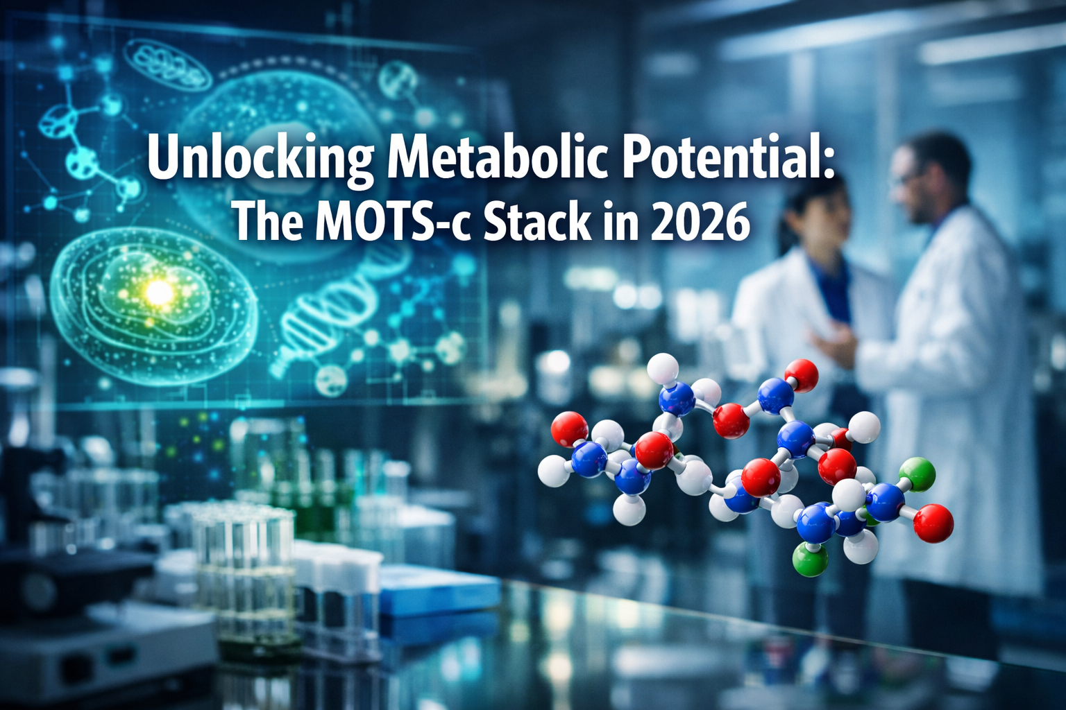 Professional landscape hero image (1536x1024) with bold text overlay: 'Unlocking Metabolic Potential: The MOTS-c Stack in 2026', modern sans