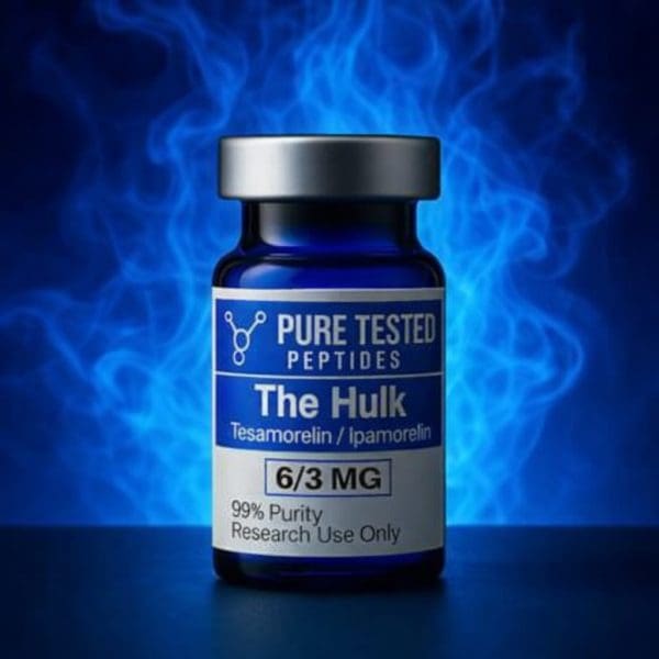 Pure Tested Peptides Unique Propriety blend “The Hulk” a synergistic blend of Tesa / Ipamorein 9MG total for research regarding boosting both GH production and GH secretion in a synergistic fashion for maximum research results.