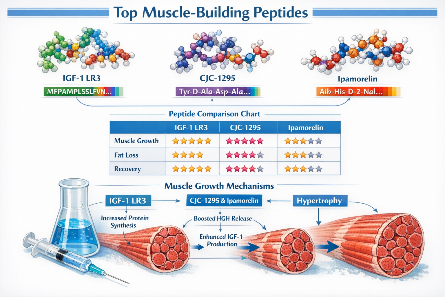 Detailed scientific illustration showing molecular structures of top muscle-building peptides including IGF-1 LR3, CJC-1295, and Ipamorelin