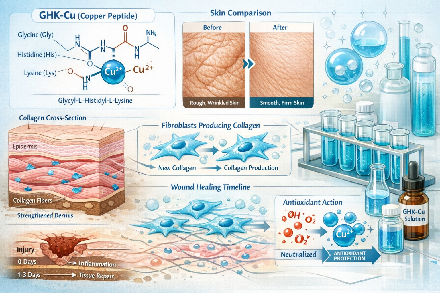 Detailed landscape infographic (1536x1024) showing copper peptide GHK-Cu molecular structure with labeled amino acid chains, before-and-afte