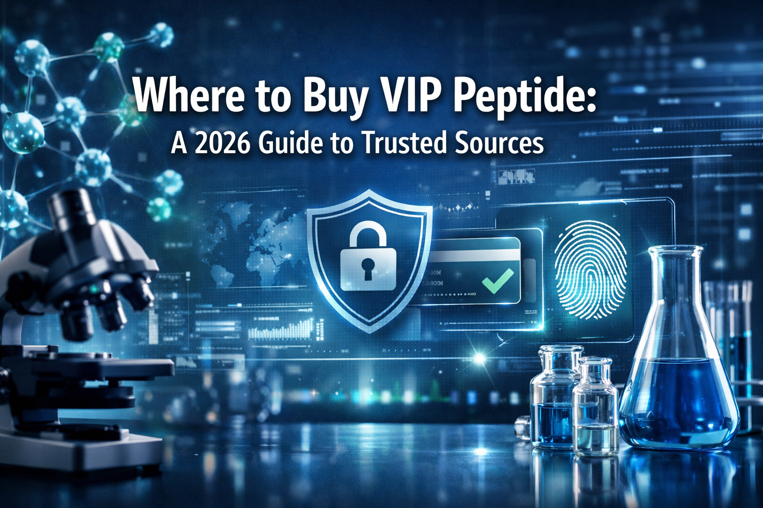 Professional landscape hero image (1536x1024) with bold text overlay: 'Where to Buy VIP Peptide: A 2026 Guide to Trusted Sources', modern sa